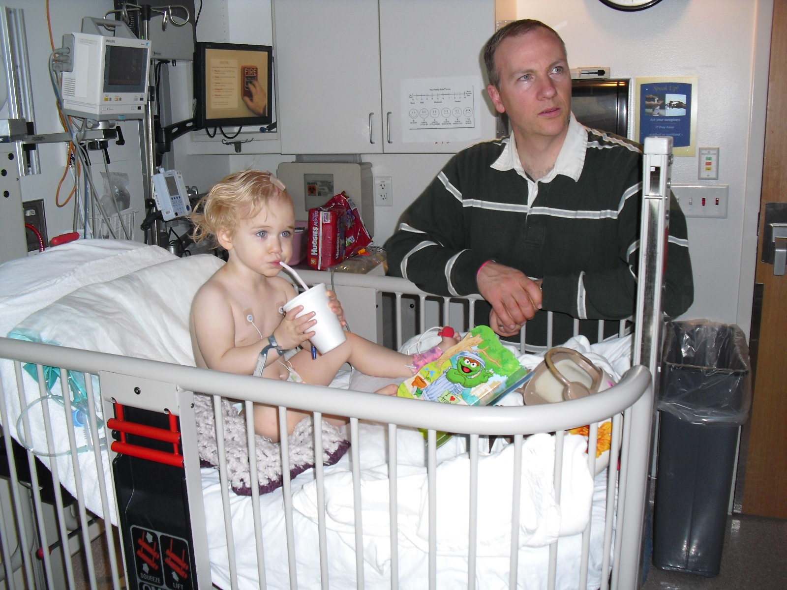 The neurosurgeon, when he came in, said she looked too well to be able to stay in the hospital. (The other kids might get jealous.) She had to have a CT scan, get her drain (draining fluid out from between the skull and the scalp) removed, get the two IV lines out, and then she could go home.